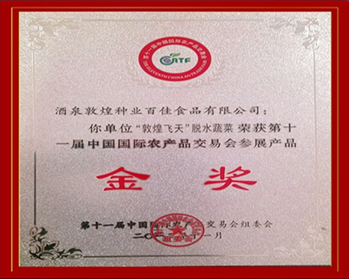 酒泉敦煌種業(yè)百佳食品公司“敦煌飛天”脫水蔬菜榮獲第十一屆中國國際農(nóng)產(chǎn)品交易會金獎