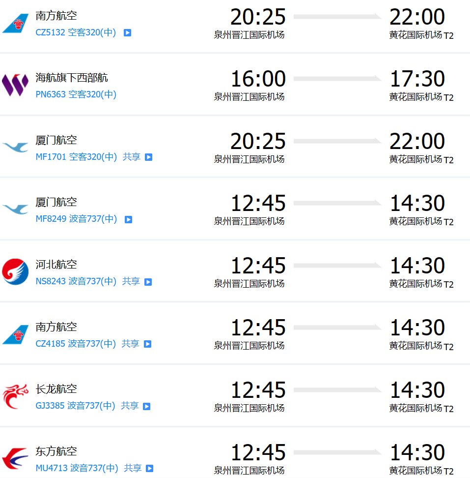 ?泉州晉江國(guó)際機(jī)場(chǎng)有直飛長(zhǎng)沙黃花機(jī)場(chǎng)的航班,具體參考如下: