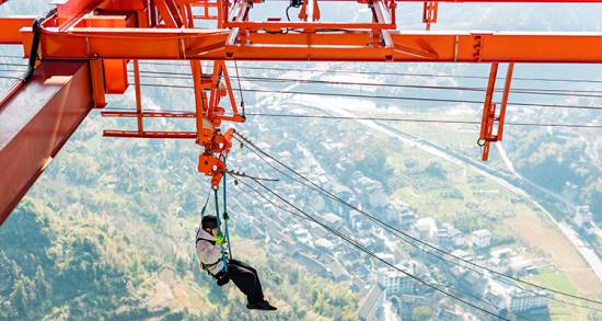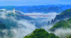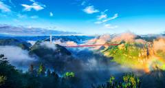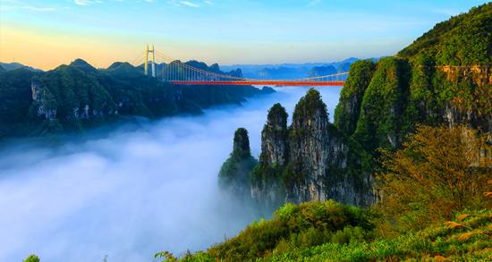 矮寨大橋飛越在德夯峽谷之巔,是世界跨峽谷跨徑最大的鋼桁梁懸索橋,大橋跨徑1176米,橋面距離峽谷底部355米。2007年10月開始修建,2012年3月建成通車,總造價15億元。大橋以克服了五大“世界級”施工難題和創(chuàng)造了四項“世界第一” 的高科技含量享譽中外,被贊為橋梁建筑藝術和自然景觀完美結合的典范。矮寨大橋不只是連接湘渝的重要交通設施,更是湘西的標志性景點。
