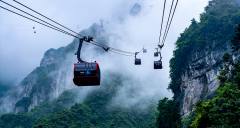 天門山索道全長7455米,水平高差1279米,沿線盡為絕壁天險,氣勢沖天,是世界上最為壯觀的索道之一。它以張家界市中心城市花園為起點,經(jīng)民間田園風(fēng)光而達山頂?shù)脑伎罩谢▓@,猶如一道彩虹飛渡“人間”“天上”。