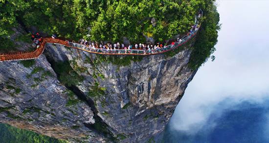 棧道全長1600米,平均海拔為1400米,起點是倚虹關(guān),終點到小天門。與其他棧道不同的是,鬼谷棧道全線既不在懸崖之巔,也不在懸崖之側(cè),而是全線都立于萬丈懸崖的中間,給人以與懸崖共起伏同屈伸的感覺。 站在棧道上俯瞰群山,古人“會當(dāng)凌絕頂,一覽眾山小”的感覺油然而生。由于天門山是國家森林公園,植被特別豐富,加上典型的喀斯特地貌,所以,在這條棧道上更能找到一種在乘坐直升飛機飛越熱帶雨林大峽谷的感覺,這平時只能在電影里看到的場景,在這里能讓你身臨其境。 由于海拔和氣流的影響,很多小鳥都不能到達與棧道平行位置。所以,站在這里,腳下是沒有邊際的綠野,成群的小鳥在峽谷中嬉戲,偶爾有老鷹從眼前掠過,閉上眼,挺著發(fā)麻的雙腿,帶著急促的心跳,伸開雙臂,你就能得到一次最完美、最刺激、最貼近自然的SPA。因為,要知道這種在懸崖上賞風(fēng)景一般都是非人類所能享受的。 如果是雨前雨后,在棧道上則是身邊霧氣盤繞,腳下云海翻騰,令人抬腿似生霧,邁步如踏云,人間天界,世外洞天也就是如此了。 據(jù)施工人員介紹,此條棧道也是他們所修棧道中施工最難,最險峻的一條。如果您還覺得不夠刺激的話,在棧道的完結(jié)處的兩個懸崖之間有一條長160米的懸索吊橋,同時,在海拔最高點還有一個挑戰(zhàn)心里極限的玻璃站臺,在這里,如果你能挺直腰板伸開雙臂,那么,您就是真正的勇士了。