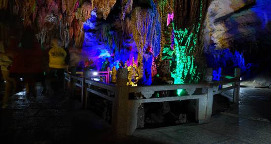 波月洞的“鵝管”長(zhǎng)短不一,參差錯(cuò)落,密密匝匝,直掛天穹,在逆光燈照下,如萬(wàn)千瑪瑙翡翠垂吊空間,晶瑩剔透,閃閃發(fā)光;觀(guān)之,不能不驚吧大自然神奇的創(chuàng)造力。